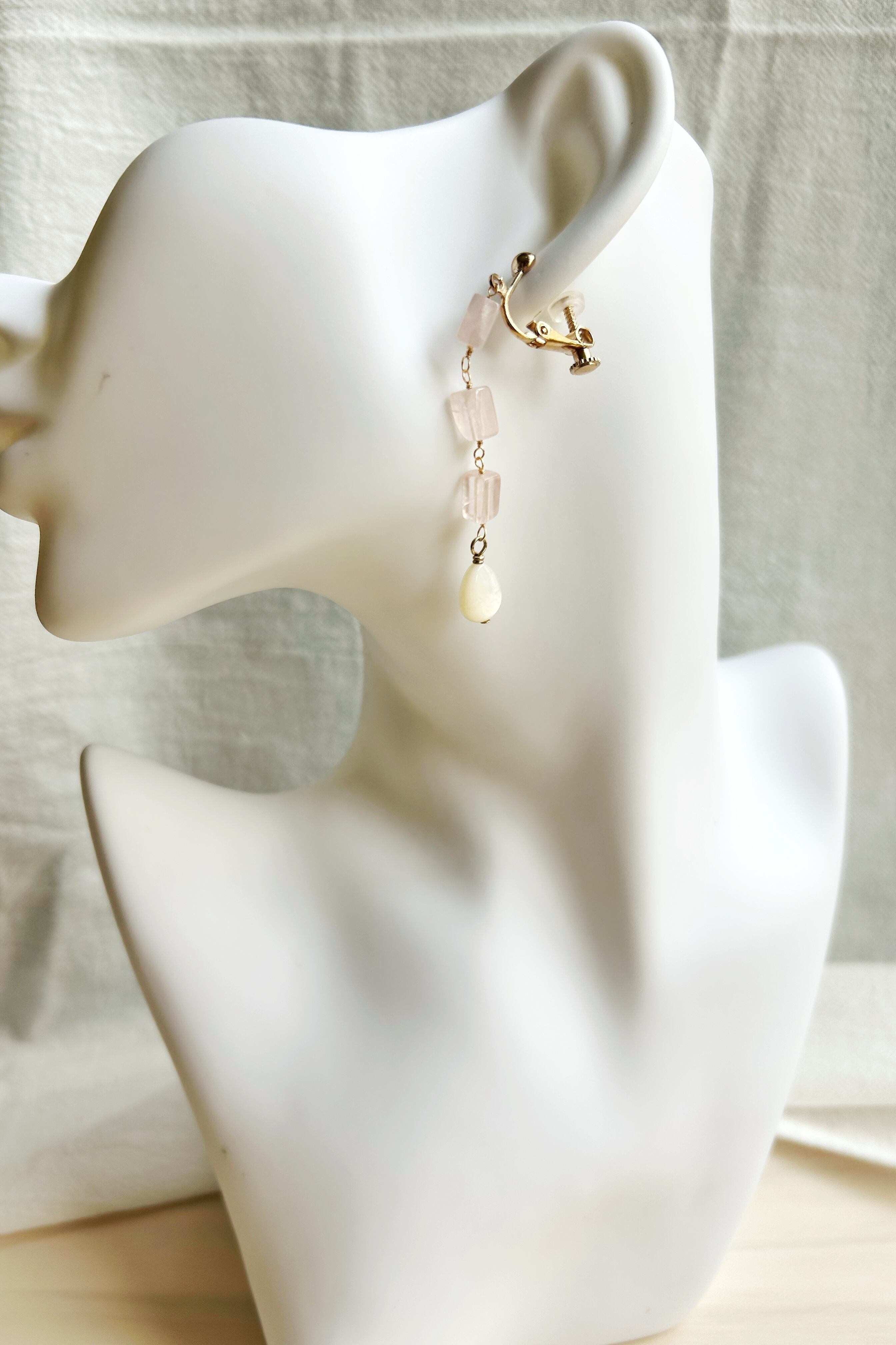 長方形のローズクォーツを3つ繋げて雫型シェルを合わせました