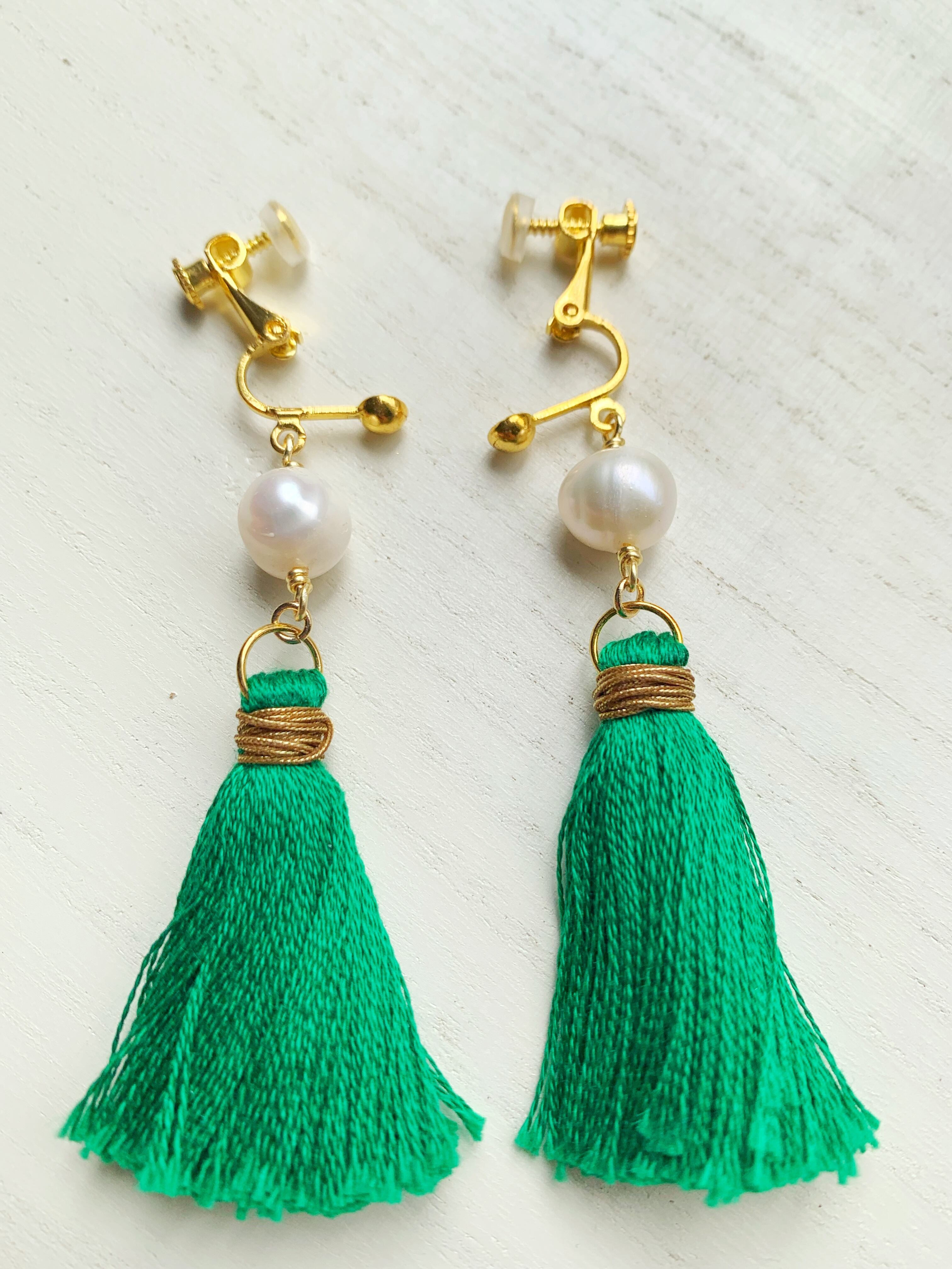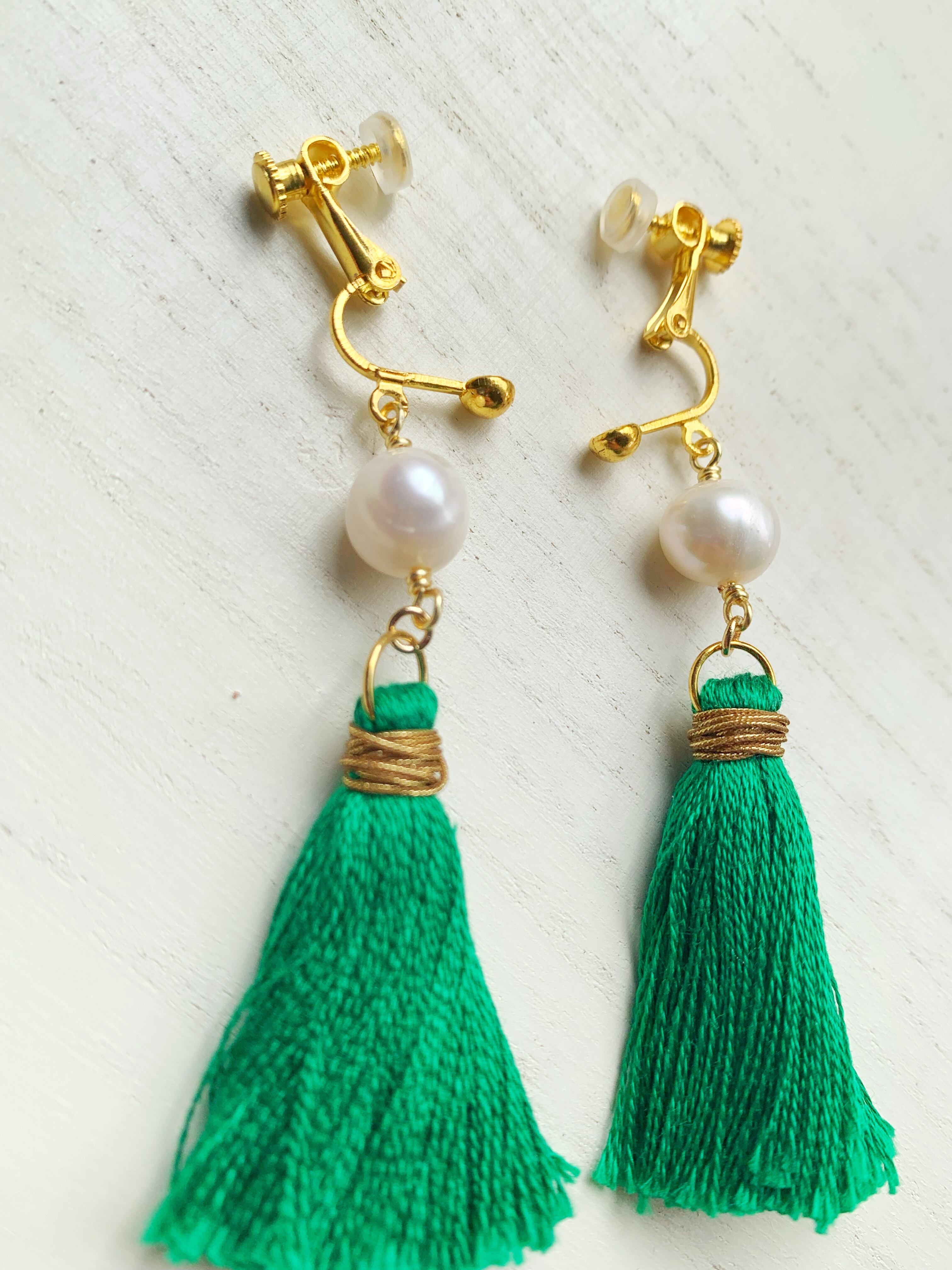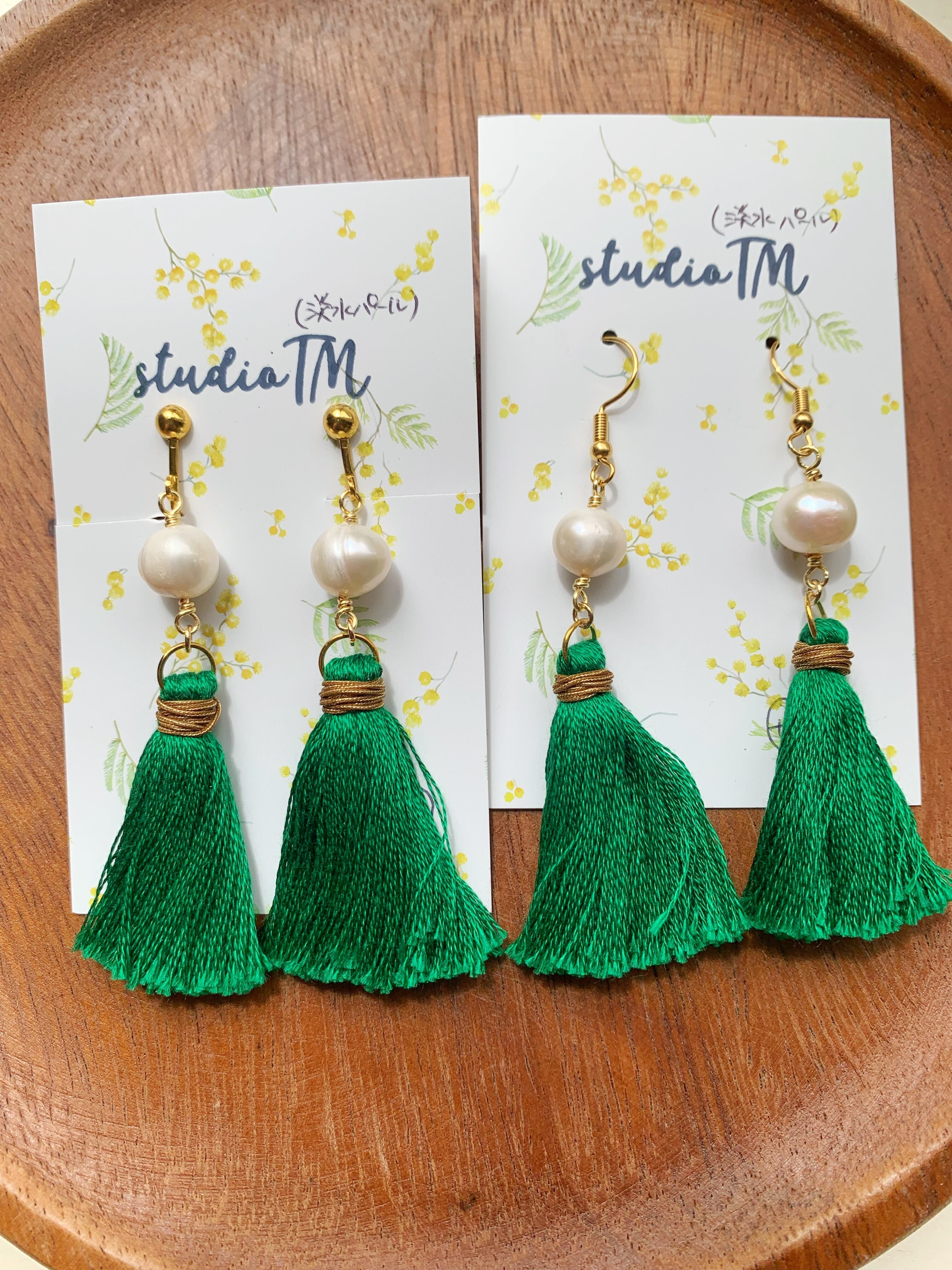 鮮やかなグリーンタッセルに淡水パールを合わせたニッケルフリーイヤリングです。