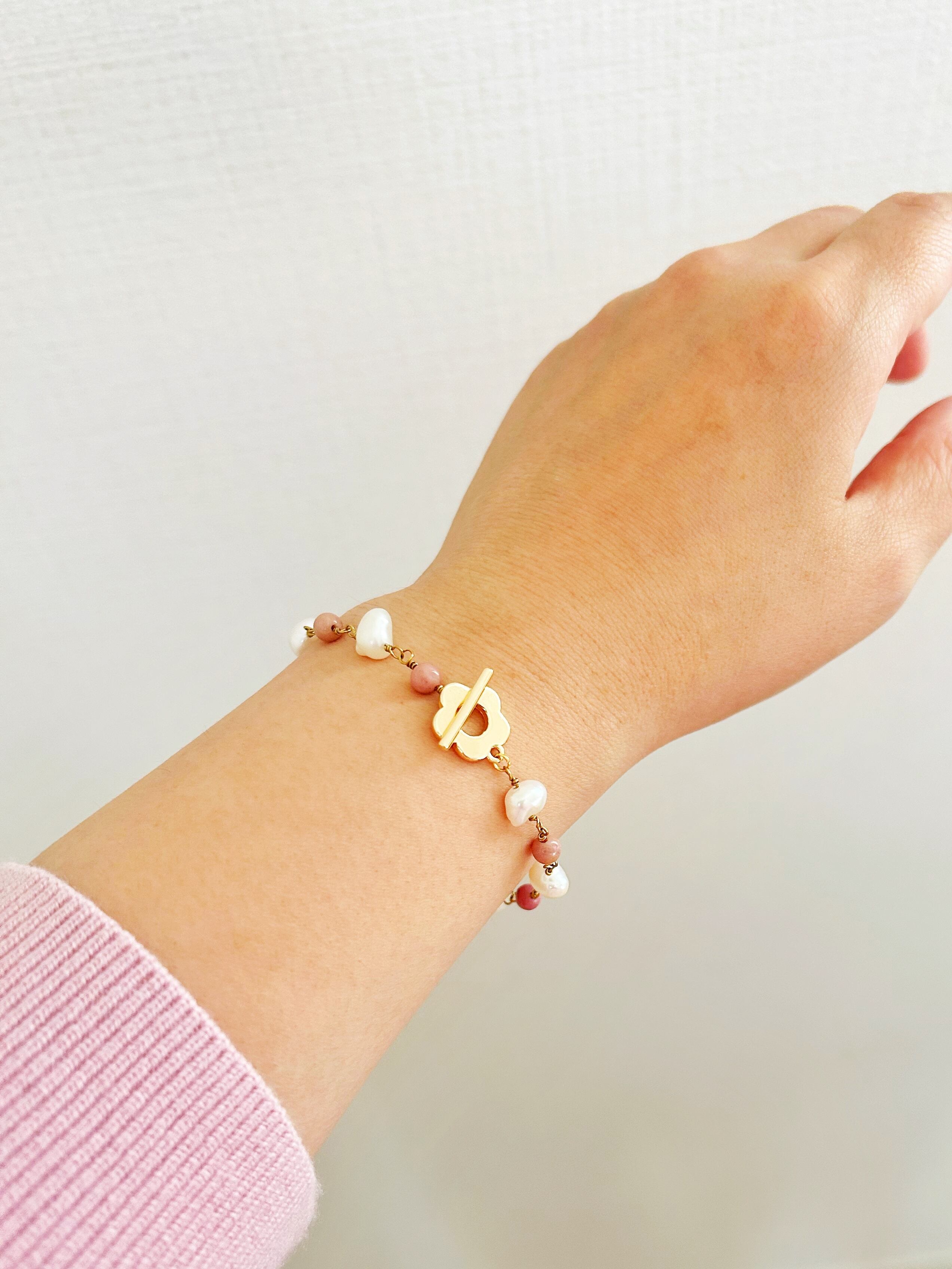 淡水パールとピンクの天然石を