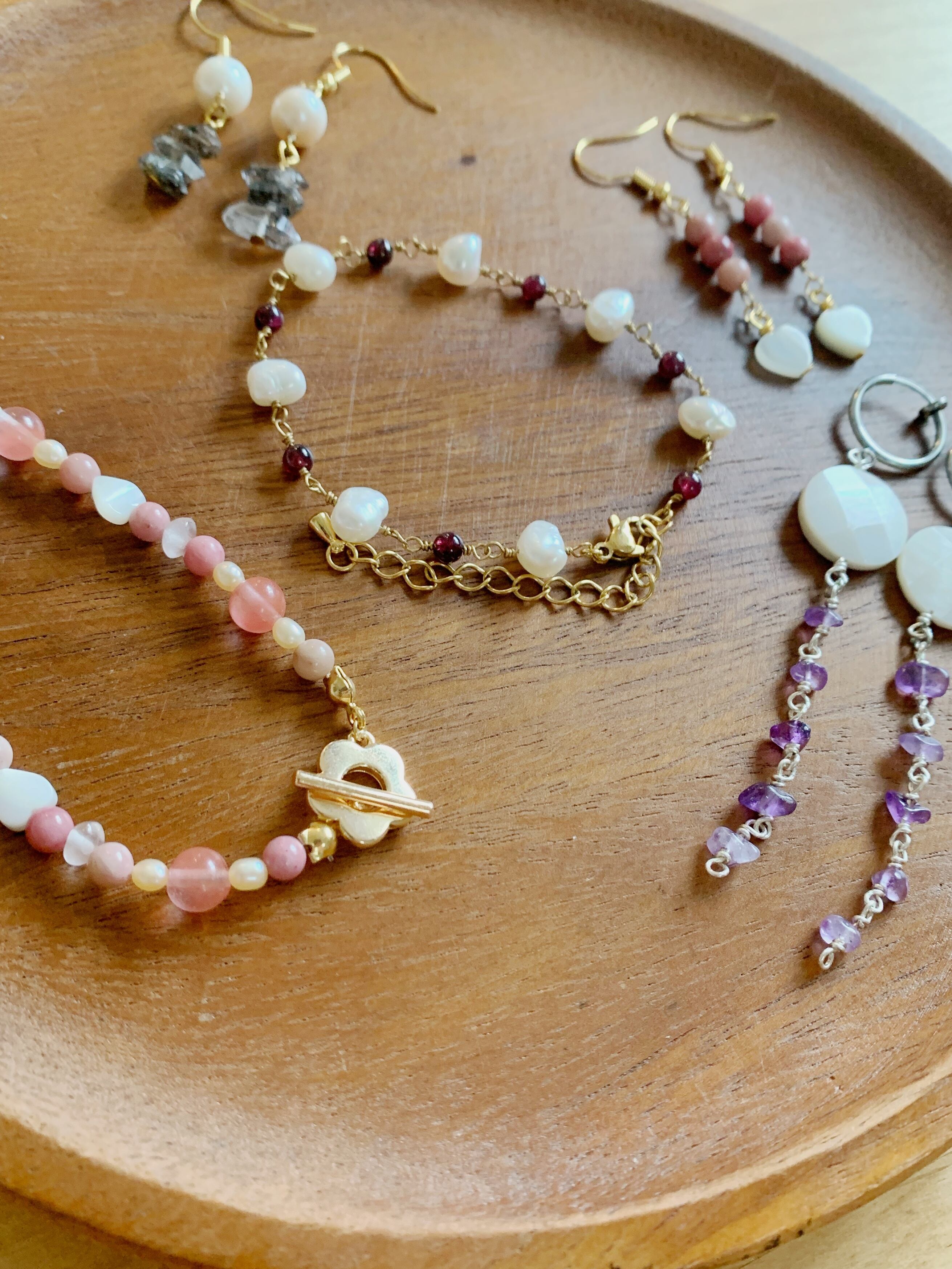 ロードナイトを3連してハート型シェルをプラスしました。 ロードナイトは色味が被らないように配置しました。 ハート型シェルが大人可愛いです。